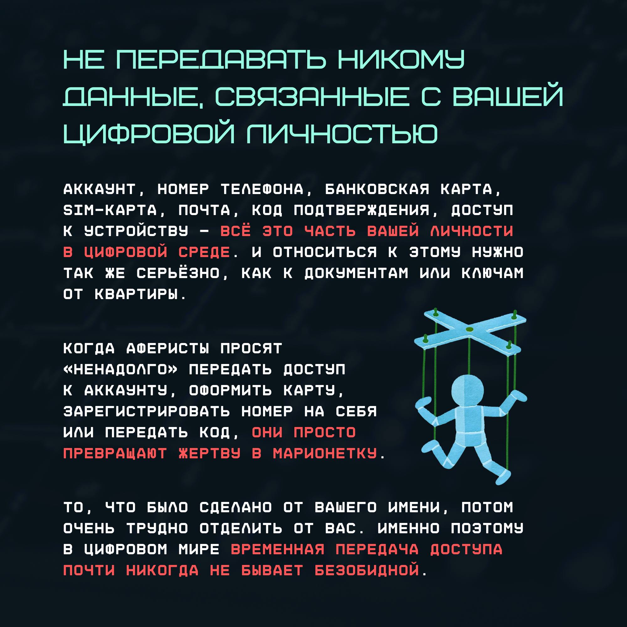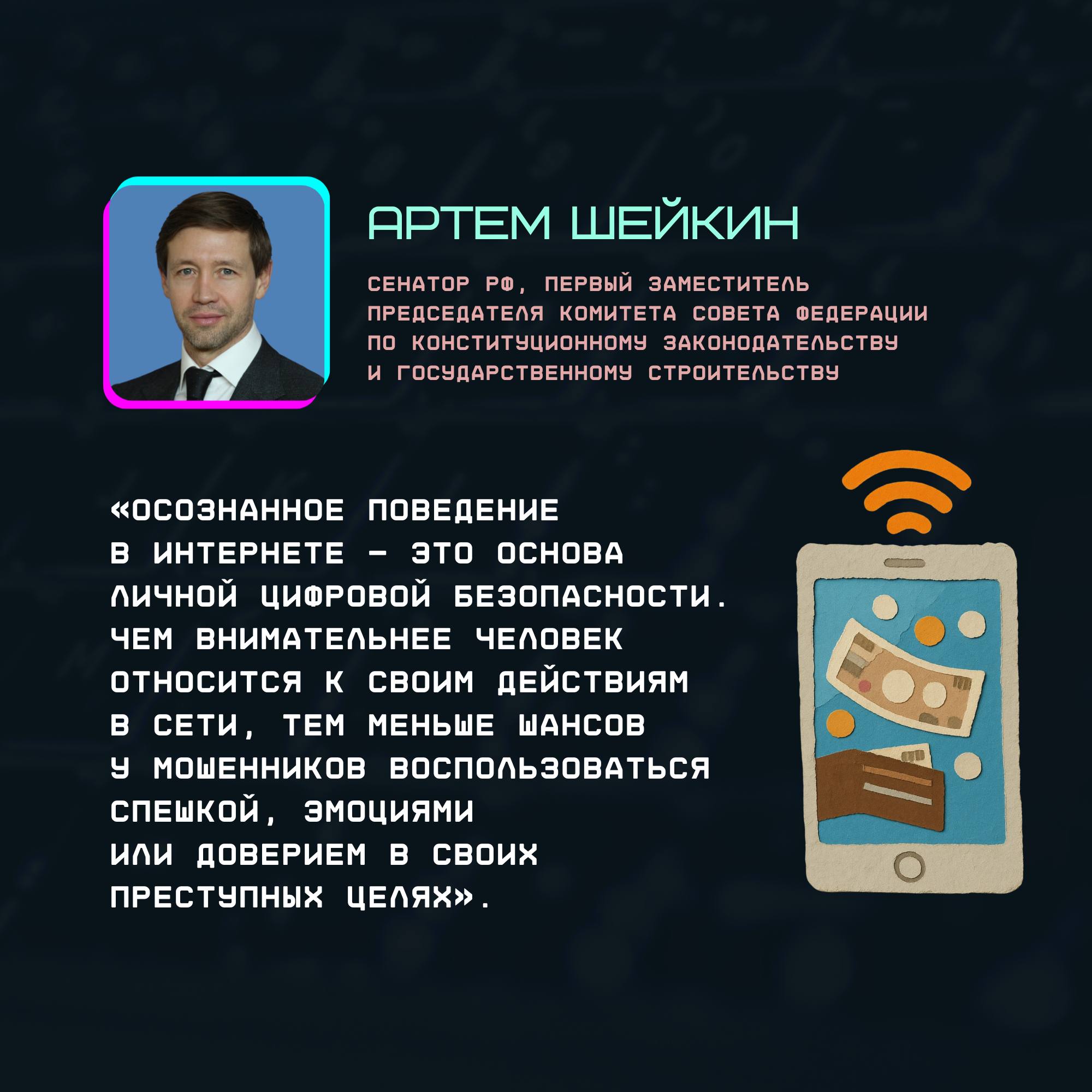 Совместно с Сенатором РФ Артемом Шейкиным подготовили инфографику о принципах безопасного поведения в сети — простых навыках, которые помогают не попасть в сценарий мошенников.