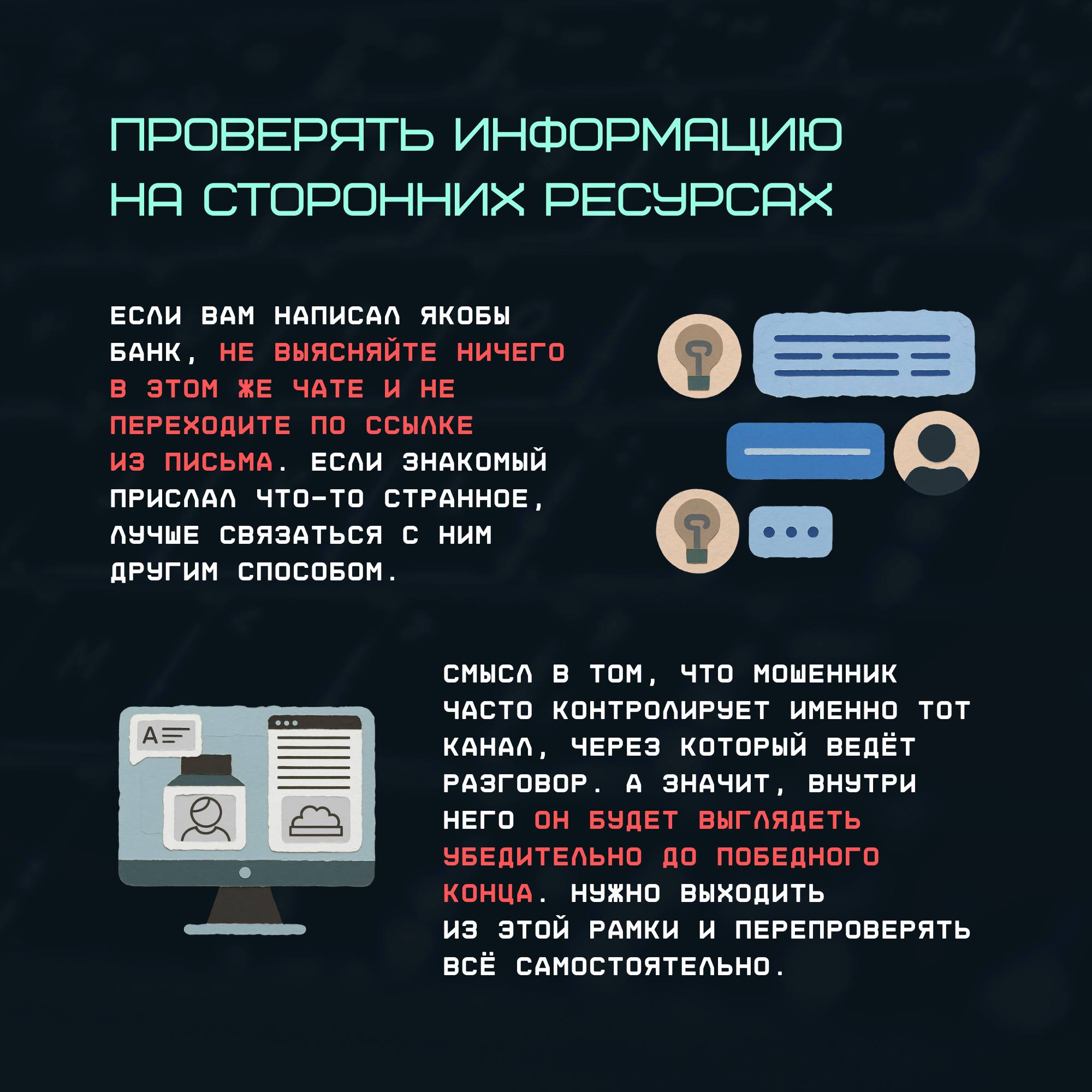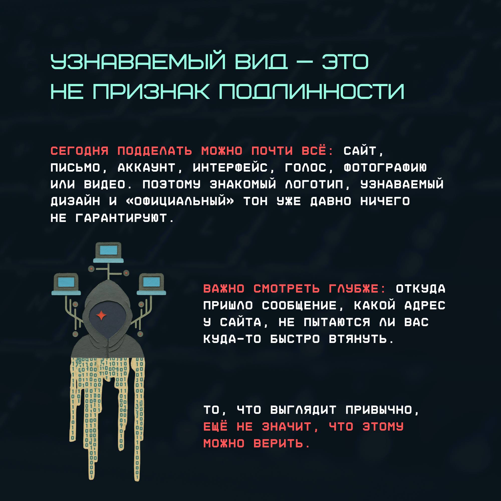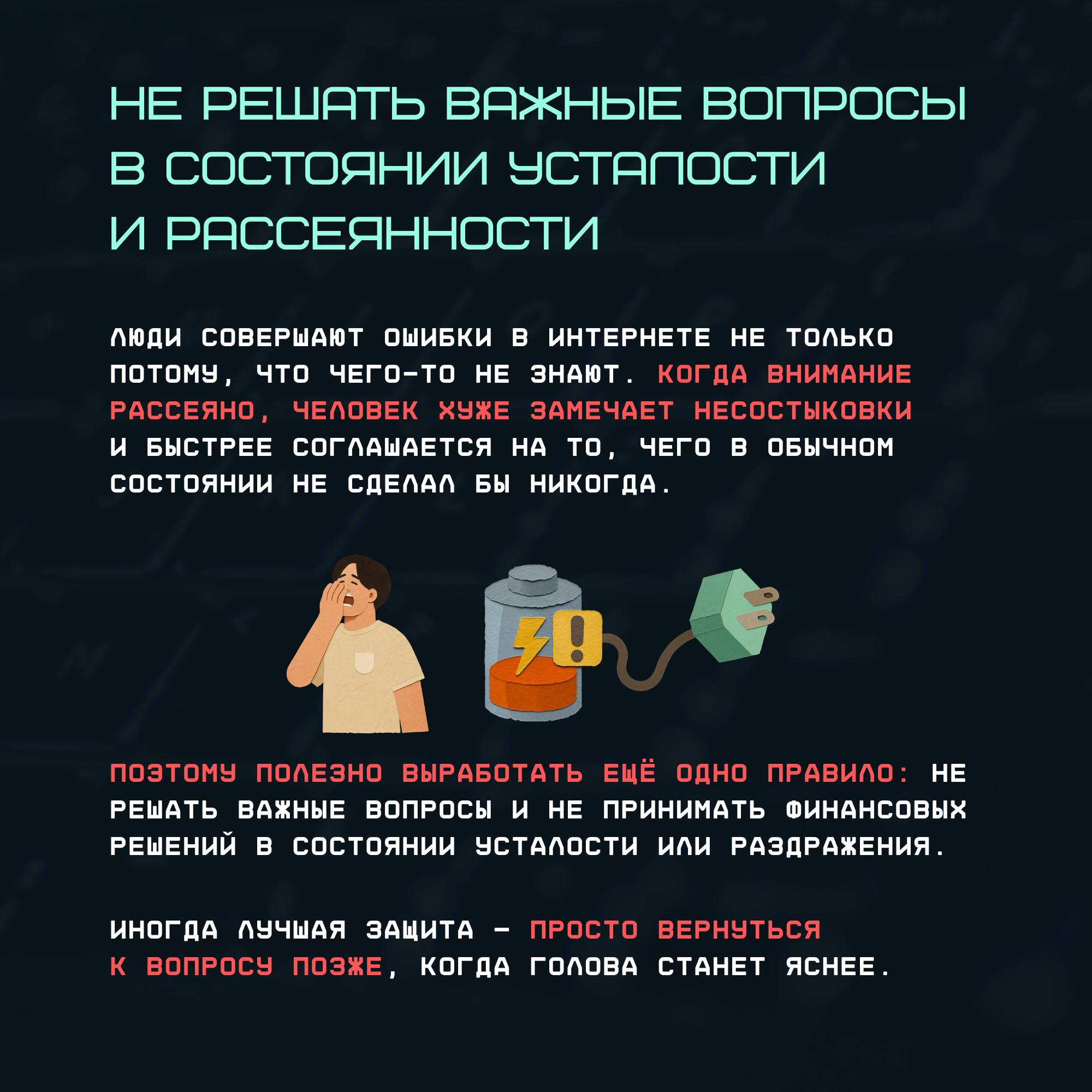 Очень часто злоумышленники используют не сложные технологии, а человеческую психологию — спешку, доверие, усталость и другие эмоциональные состояния. Именно поэтому защита предполагает не только программу-антивирус или двухфакторную аутентификацию, но и привычки, которые помогают вовремя остановиться, перепроверить информацию и сохранить контроль над ситуацией.