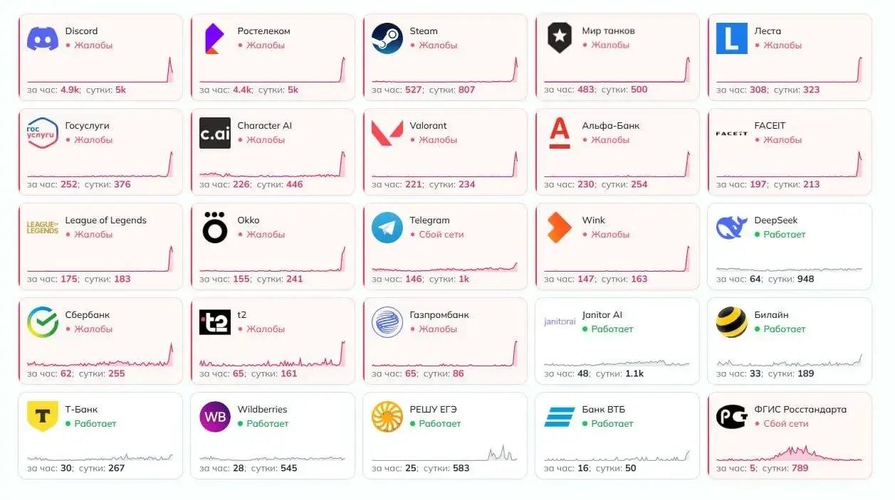Проблемы наблюдаются в том числе у ВКонтакте, Сбербанка, Discord, Steam, а также в работе «Ростелекома».