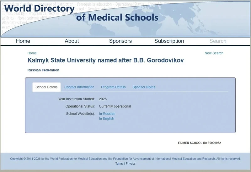 Калмыцкий государственный университет официально включен во Всемирный справочник медицинских университетов (World Directory of Medical Schools, WDMS), который курируется Всемирной организацией здравоохранения (ВОЗ) и Всемирной федерацией медицинского образования (WFME).