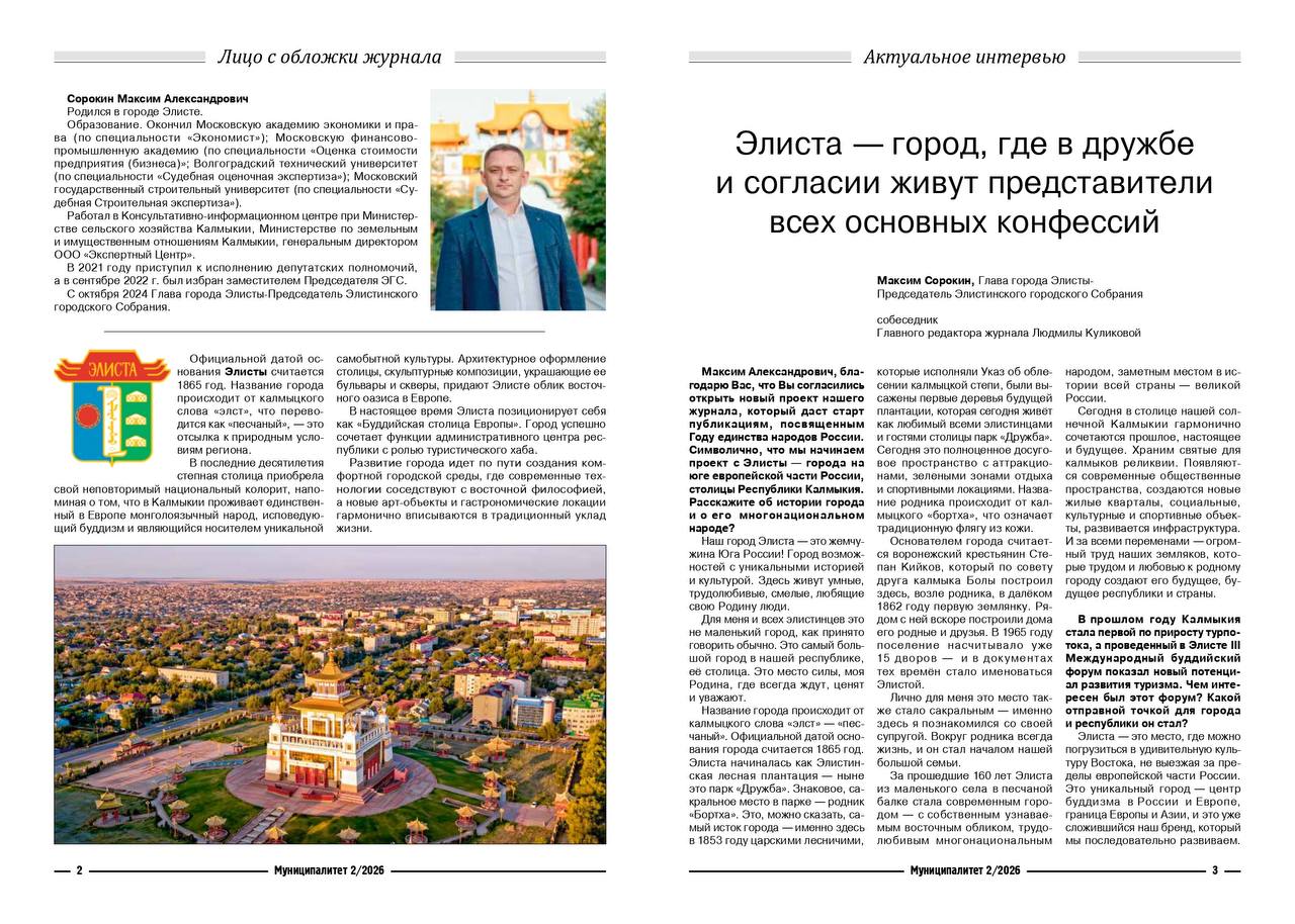 Открыл рубрику Глава города Элиста - председатель ЭГС Максим Сорокин. В эксклюзивном интервью с главредом Людмилой Куликовой он обсудил не только развитие степной столицы, но и глобальные темы: итоги III Международного буддийского форума, силу межнационального единства, роль традиционных религий и поддержку наших защитников в зоне СВО.