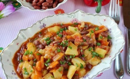 4. Добавить отварную или консервированную фасоль, перемешать и прогревать блюдо еще 5-6 минут.