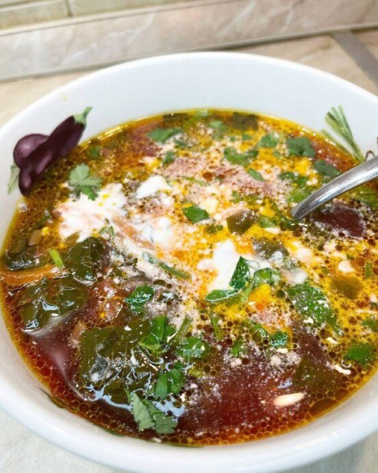 В конце добавить свекольную ботву и зелень. Довести до кипения и выключить.