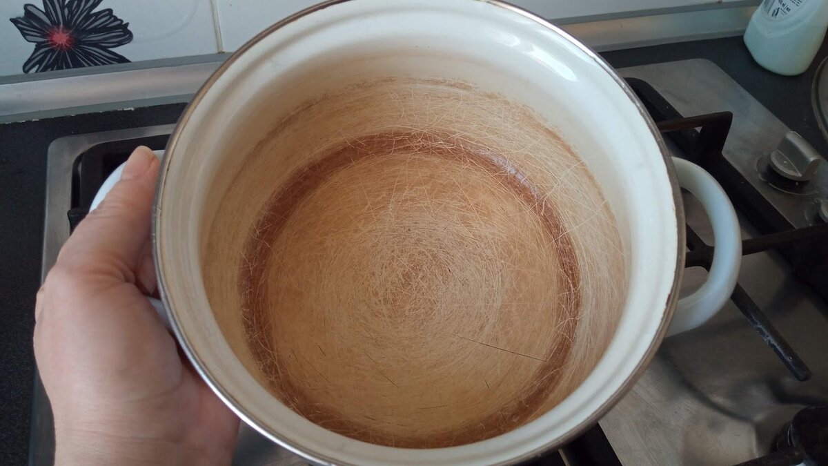После завершения кипячения, кастрюле оставляют остыть. На этом этапе желтизна и темный налет начинают растворяться. Для финальной чистки подойдет жесткая сторона губки с обычным моющим средством. Иногда на дне все же можно заметить небольшое потемнение, однако такая эмаль может быть повреждена из-за частого использования.