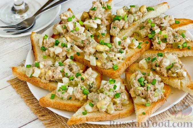 Начнем с закуски, которую любят и взрослые, и дети. Гренки с тунцом, яйцами и маринованными огурцами станут хитом любого стола. Чтобы приготовить это блюдо, просто обжарьте хлеб до золотистой корочки и выложите на него смесь из консервированного тунца, яиц и огурчиков. Подача на тостах придаст яркости и праздничного настроения.