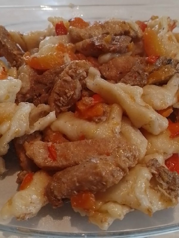 Сегодняшний день обещает настоящие кулинарные наслаждения. На столе царит ароматное тушёное мясо, которому составляют компанию яркие сладкие перцы, лук и морковь. Все это великолепие приправлено домашней лапшой, что делает блюдо не только сытным, но и по-настоящему семейным!