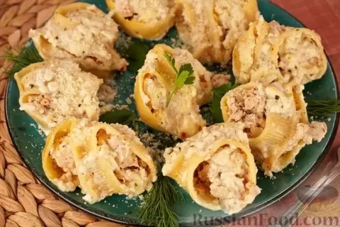 - Фаршированные макароны-ракушки — это восхитительное и сытное блюдо, наполненное куриным фаршем и под сырно-сливочным соусом. Убедитесь, что это станет хитом вашего ужина.