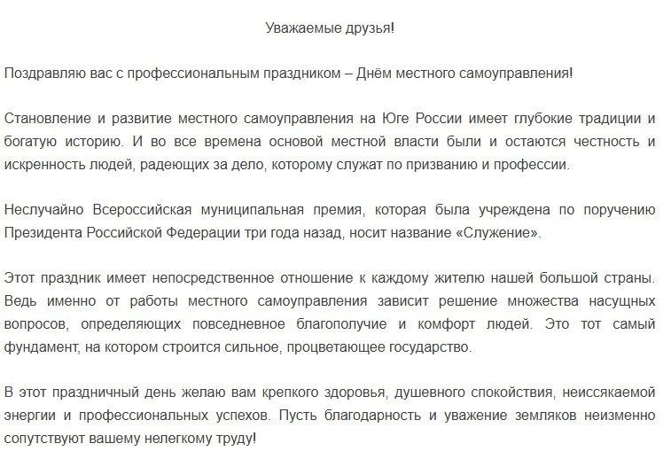 Владимир Устинов поздравил глав муниципалитетов ЮФО с Днём местного самоуправления.