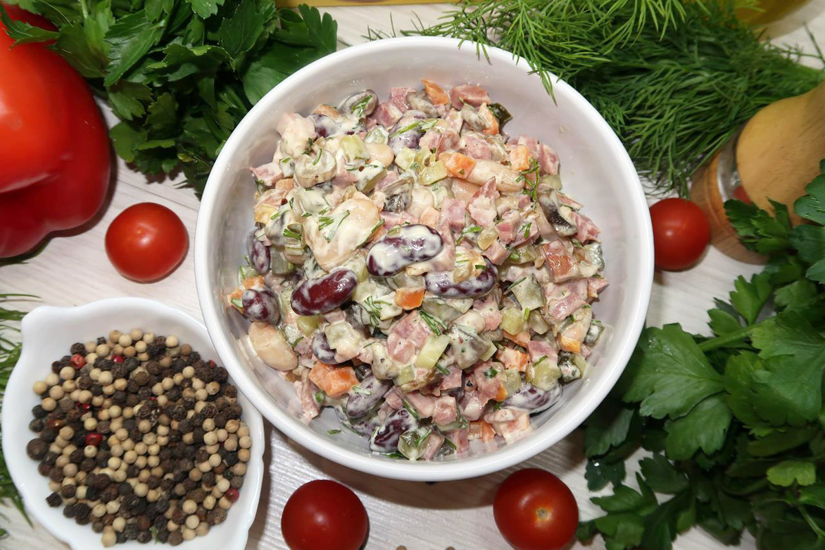 Салат Краковский стал настоящей находкой для любителей сытных и аппетитных блюд. Этот рецепт отличается простотой в выполнении и скоростью приготовления. Вам всего лишь нужно нарезать ингредиенты и тщательно перемешать их — проще не придумаешь! Заправка для салата — классический майонез, и его можно подавать сразу, без необходимости настаивания.