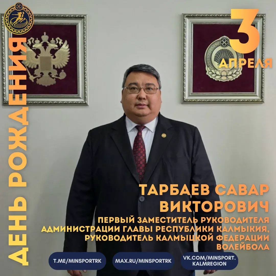 Сегодня, 3 апреля, день рождения Савaра Викторовича Тарбаева, первого заместителя руководителя Администрации Главы Республики Калмыкия, руководителя Калмыцкой федерации волейбола.